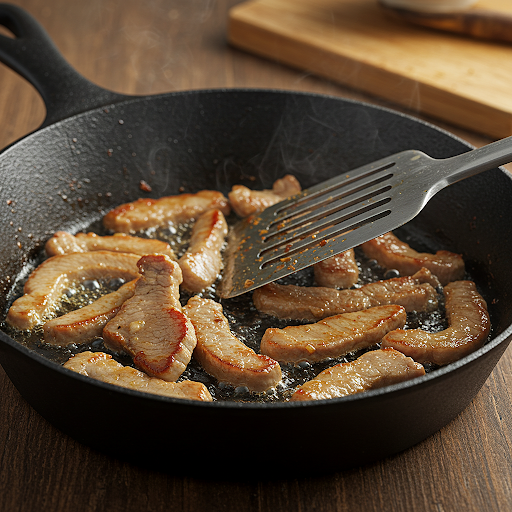 달군 팬에 기름을 두르고 밑간한 돼지고기를 넣고 볶아줍니다.